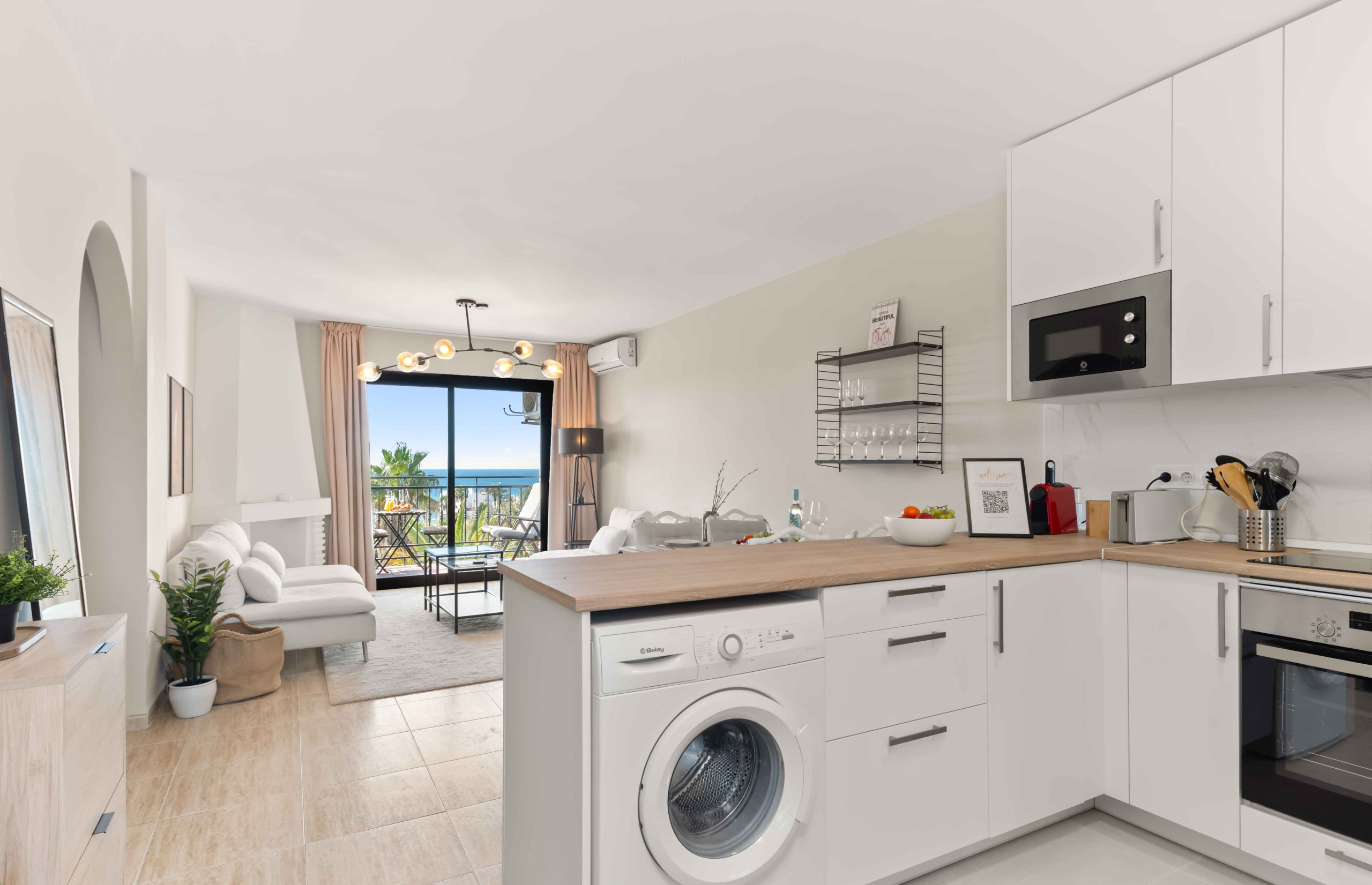 👩🏼🍳 Cocina abierta espaciosa con cafetera, nevera y congelador, y lavadora