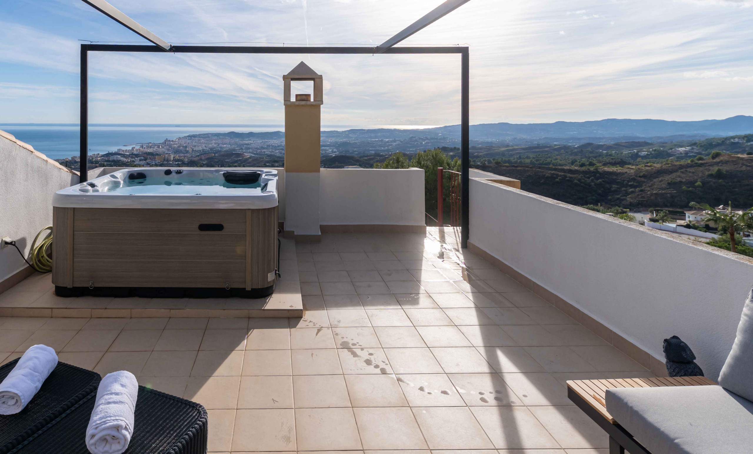 🌅 Terraza en la azotea con gran jacuzzi, tumbonas y sofá lounge