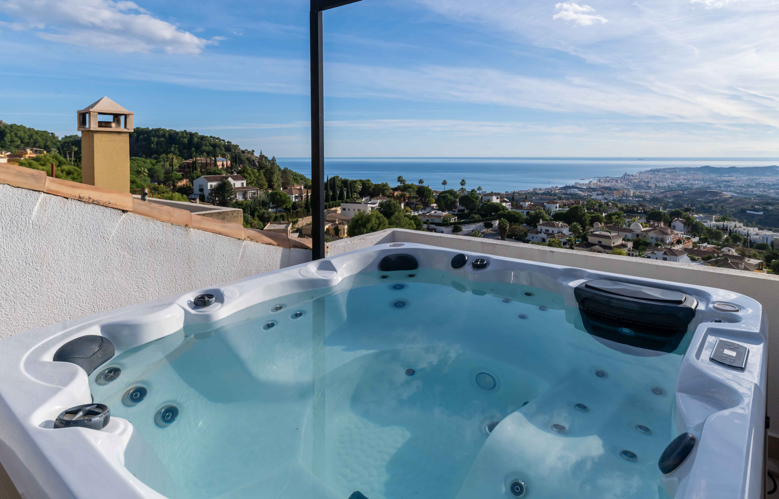 Espectacular vista al mar desde nuestra casa adosada moderna en Buena Vista✨ Disfrute de la terraza en la azotea con una acogedora jacuzzi, ducha al aire libre, tumbonas y sofá 🏞️ ¡Mucho espacio para toda la familia!