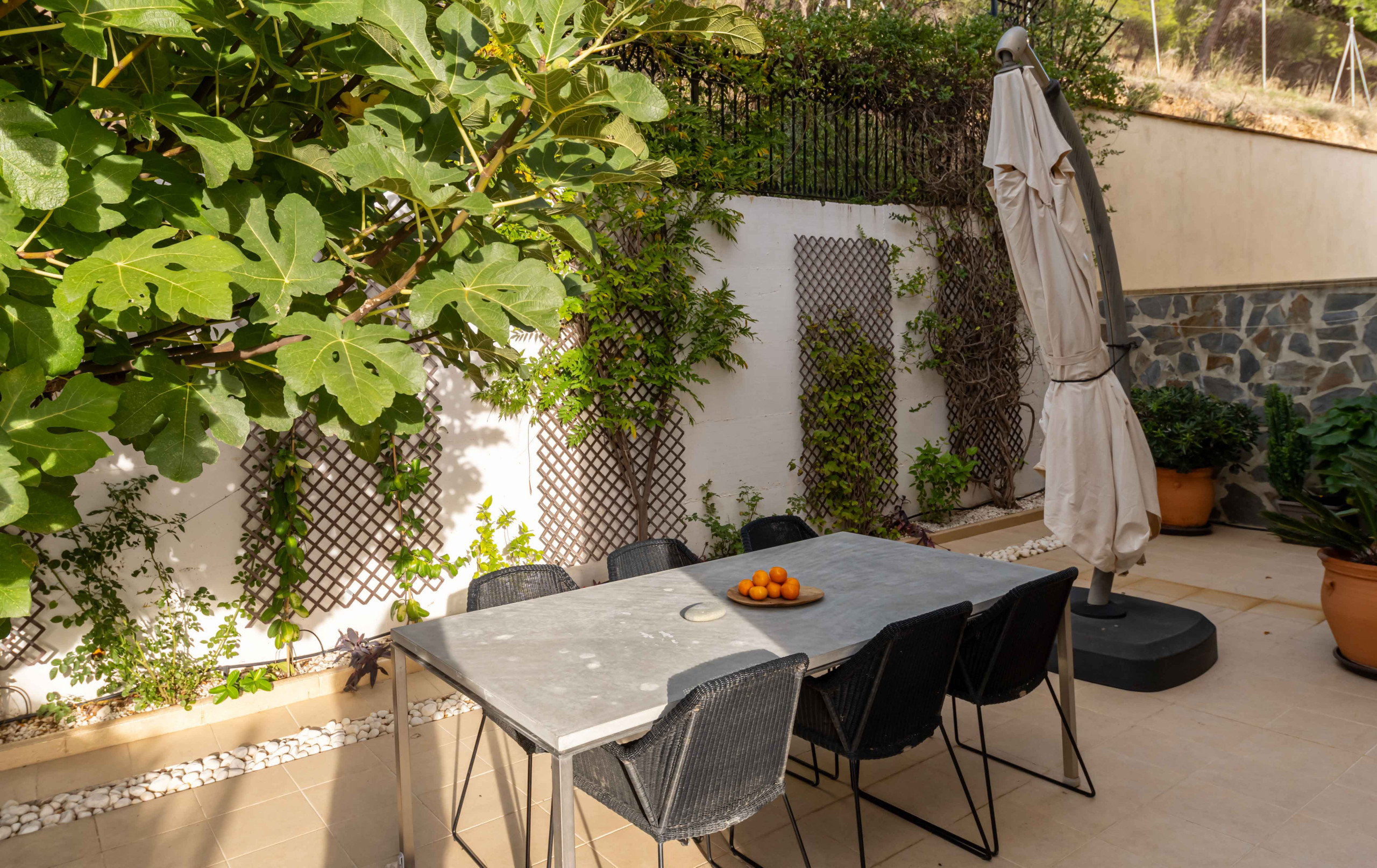 ☀️ Grandes terrazas soleadas con barbacoa, zona de comedor, sombrilla, muebles acogedores, plantas y ambiente 🪴